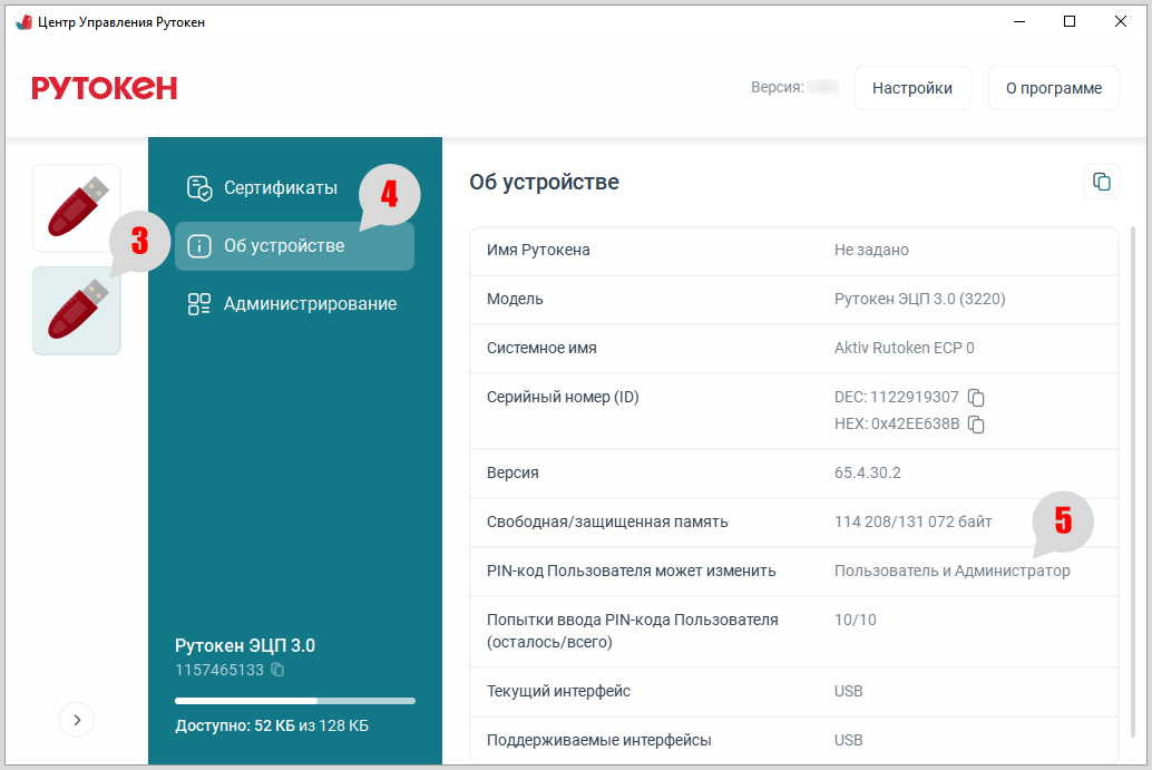 - На боковой панели для выбора устройства нажмите на нужный Рутокен.