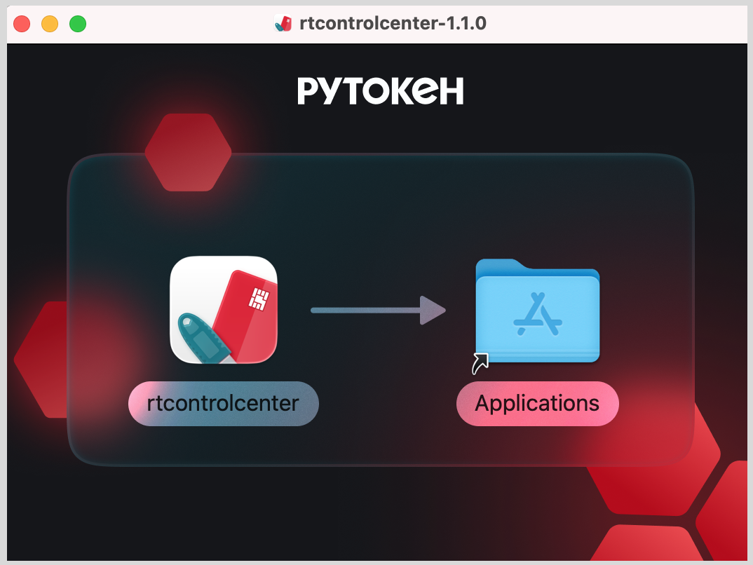 4. Запустите файл rtcontrolcenter-1.1.0.dmg. Откроется окно установки Центра управления Рутокен.