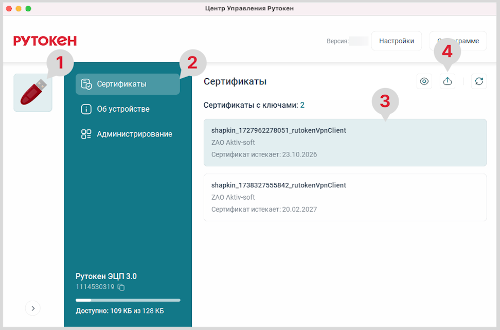 1. На боковой панели для выбора устройства нажмите на нужный Рутокен.