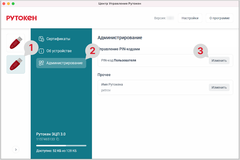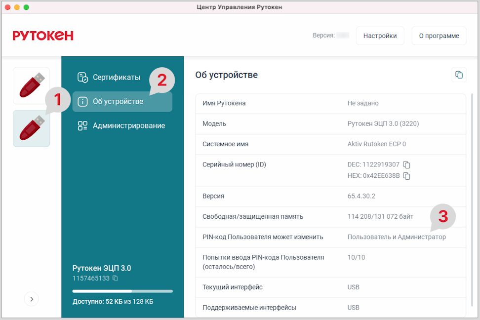 - На боковой панели для выбора устройства нажмите на нужный Рутокен.