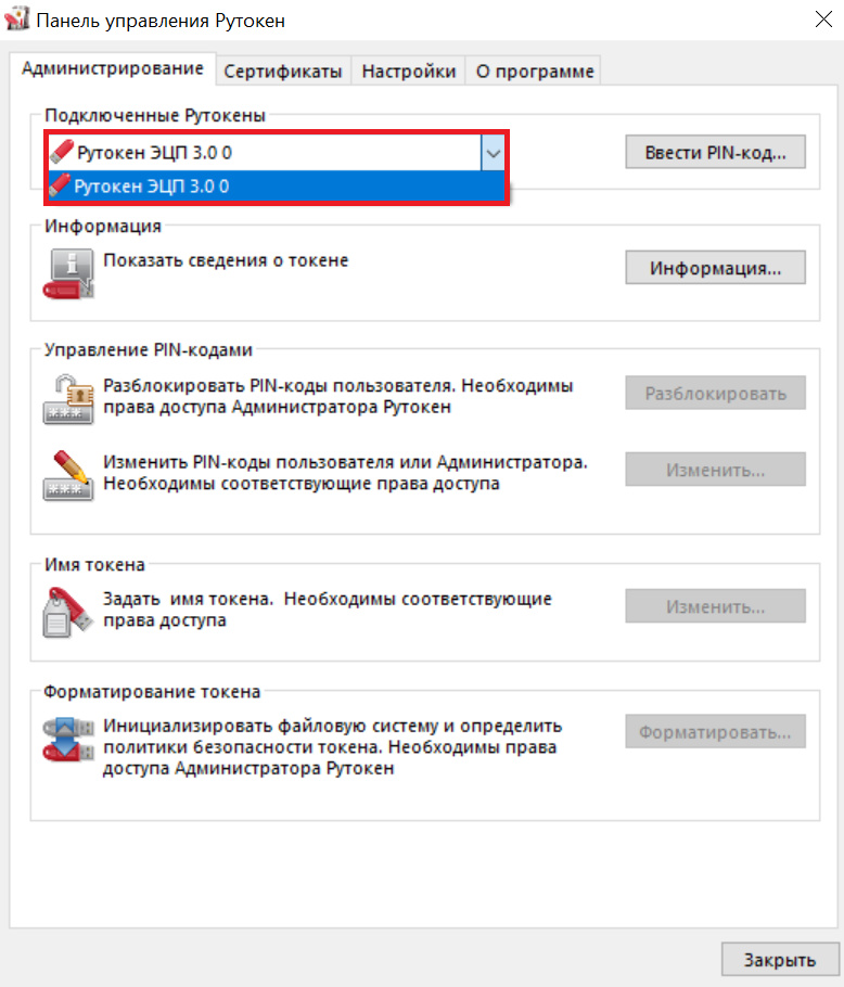 - Чтобы выйти из Панели управления Рутокен, нажмите Закрыть.
